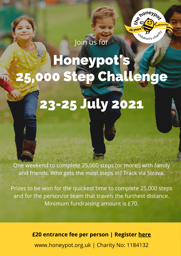 Wear yellow & black in support and tag your photos to #Honeypot25000stepchallenge