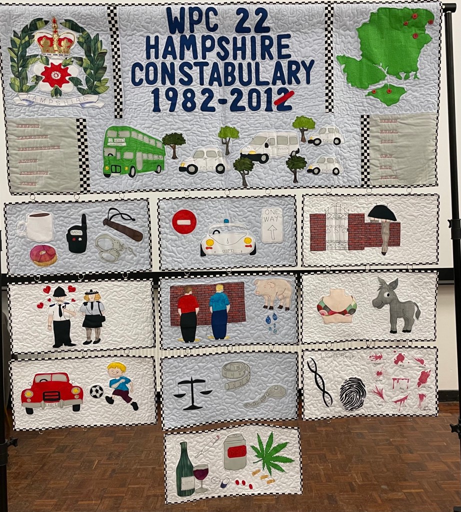 Through her quilts she talked about her career as a WPC which involved progressing from the most junior as a 25 year old in urban policing, child protection, vulnerable adults, public protection unit, working in schools and the scenes of crime unit. A fascinating insight into her carer as a Police Officer. A lot of amusement to her talk entitled The Good, The Bad and the Downright Funny.