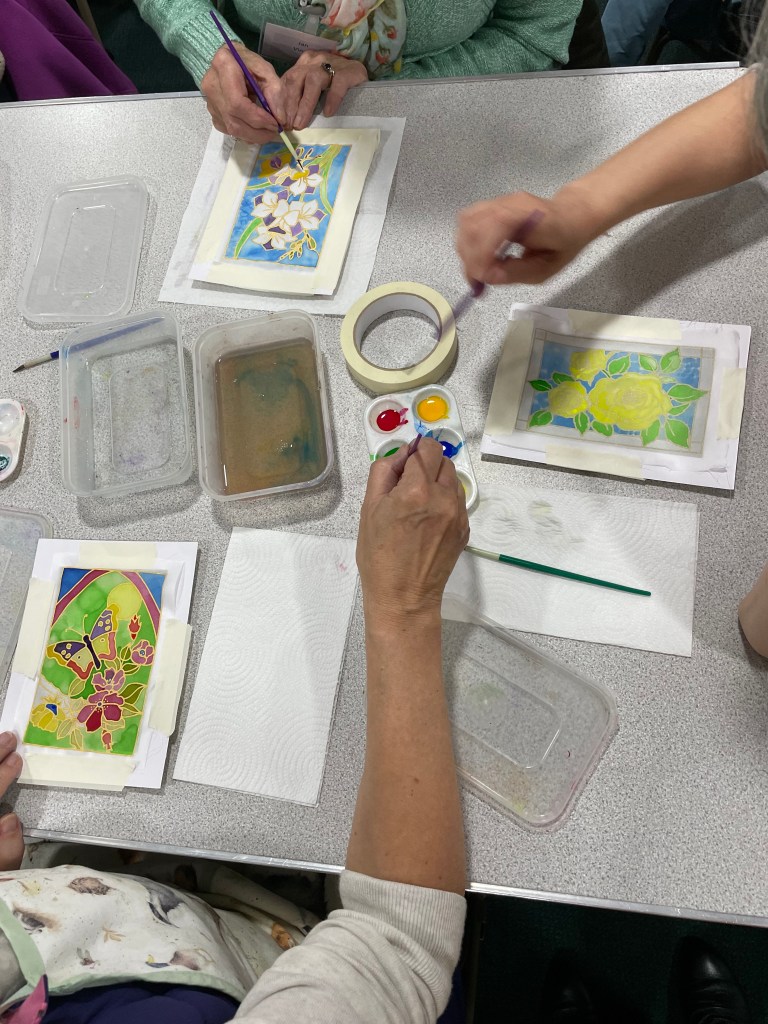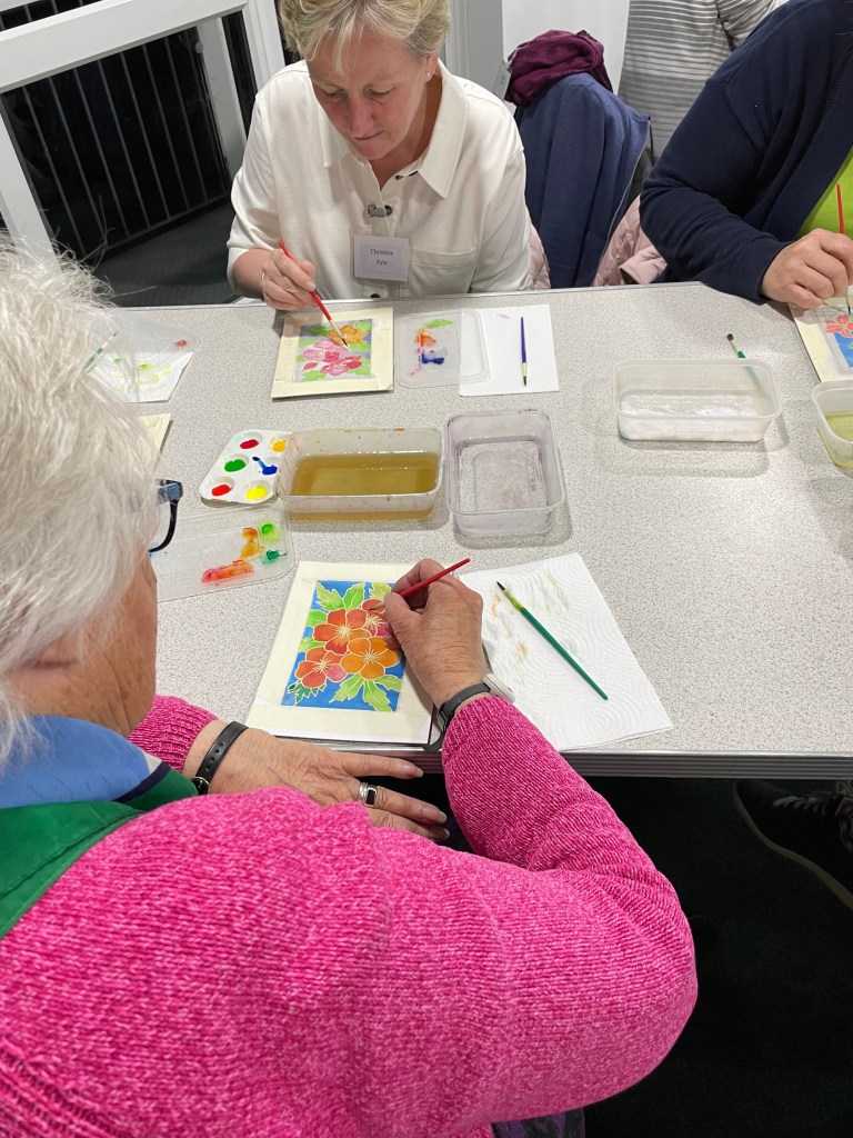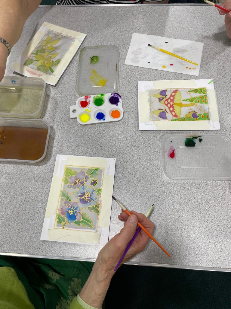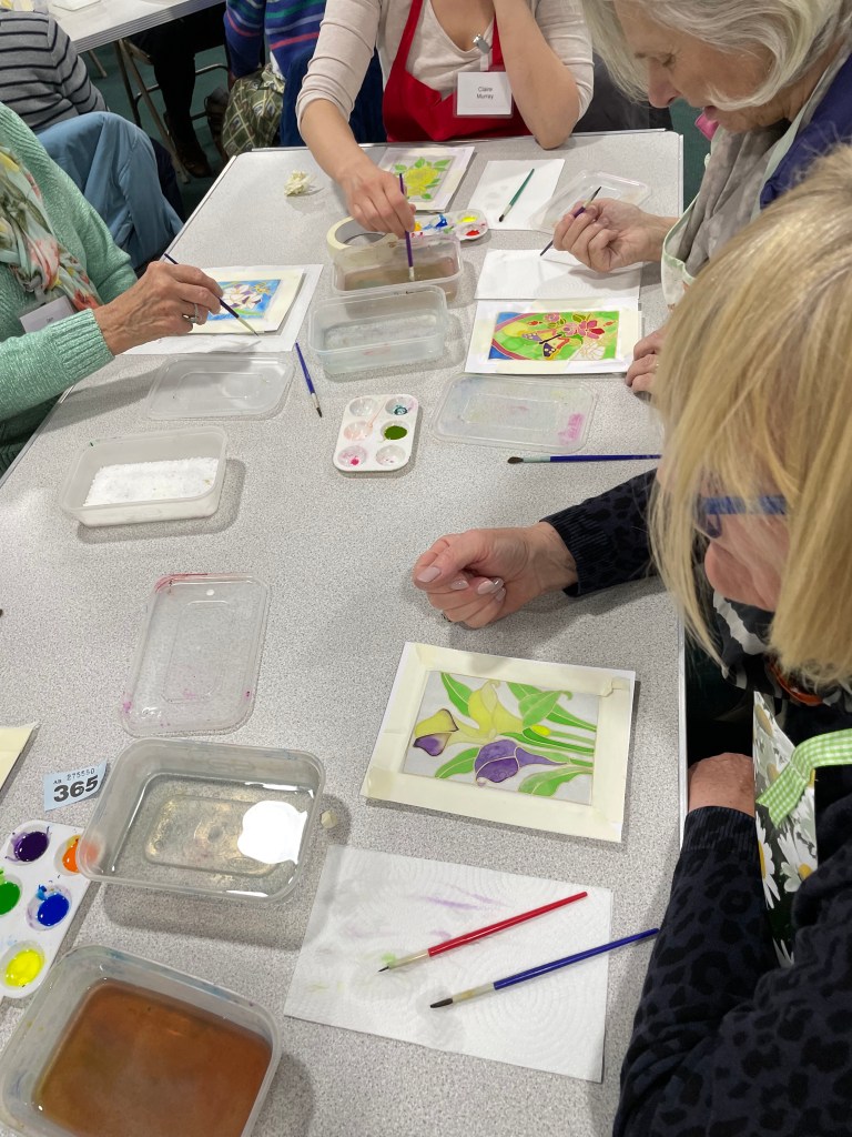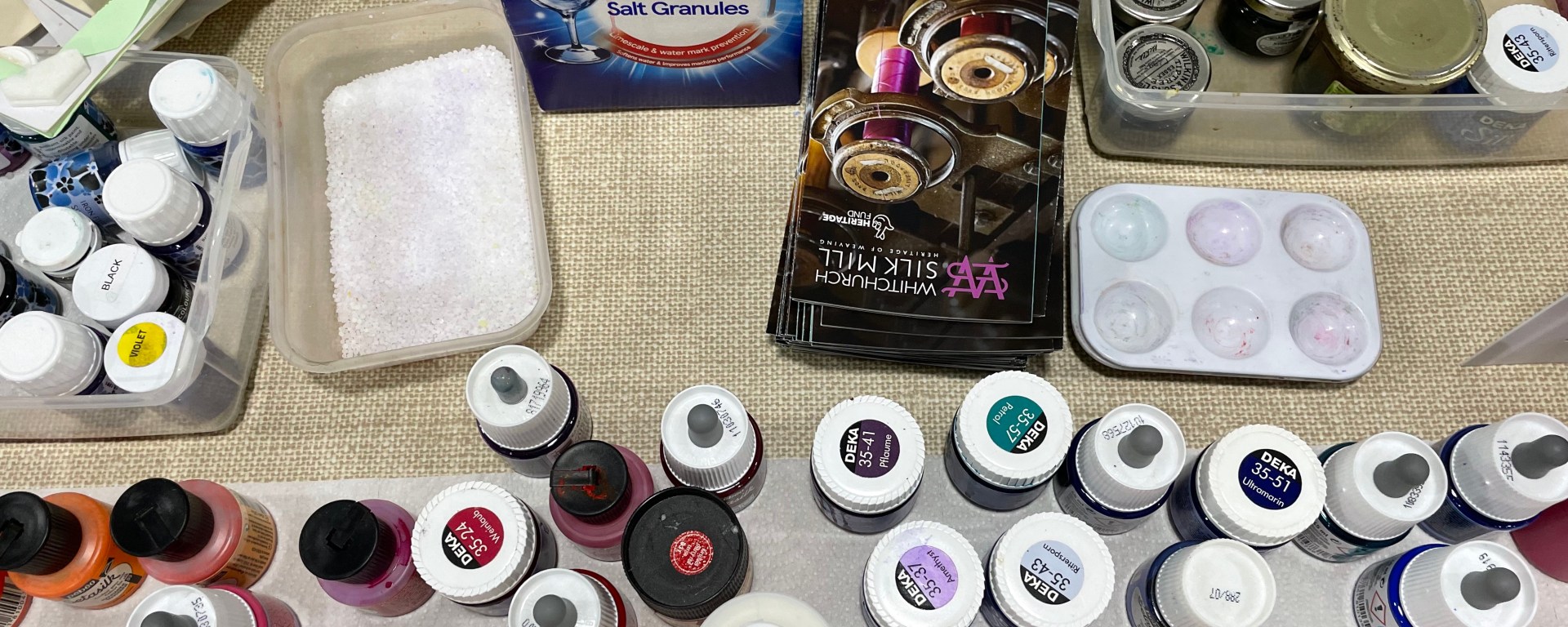 This month our speaker was Deborah Wheeler from Whitchurch Silk Mill. She gave us a light hearted introduction to Silk Painting. Whitchurch Silk Mill is the oldest Silk Mill in the UK and is still in the original Grade 2 building. Silk painting originated in Thailand, Vietnam, India, China and Japan. Silk painting is the practice of applying paint to silk textiles.