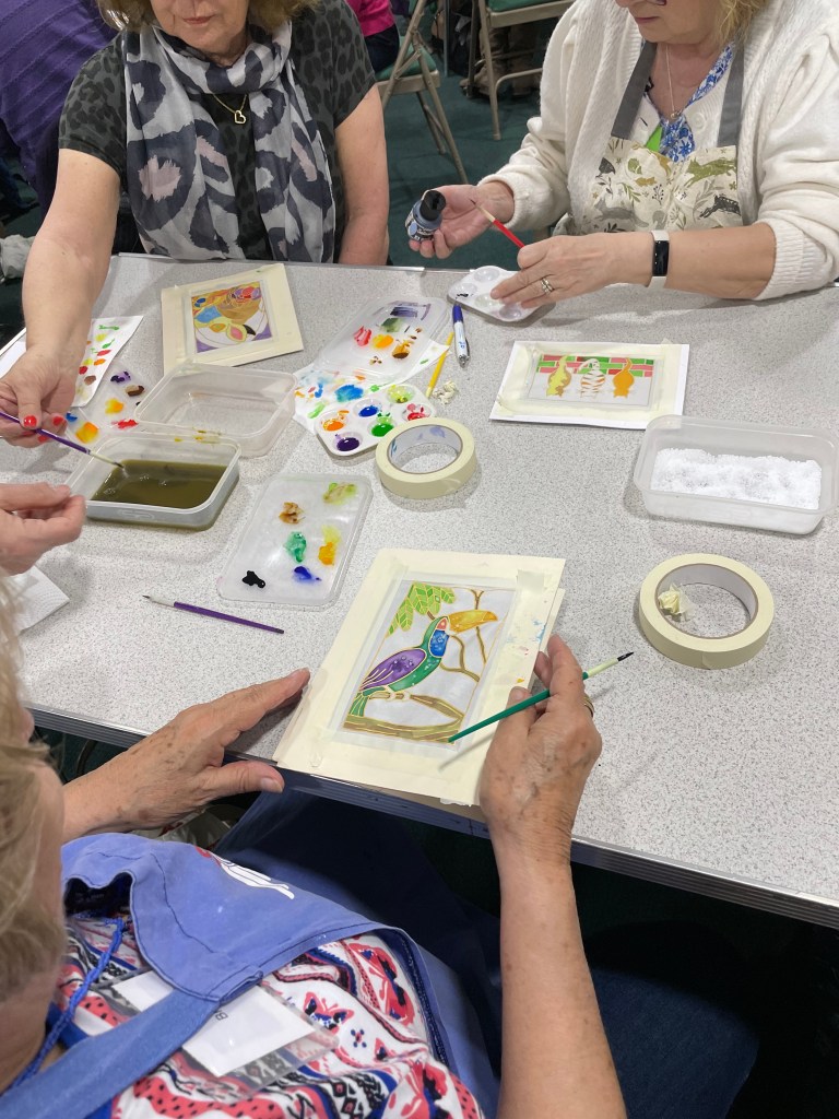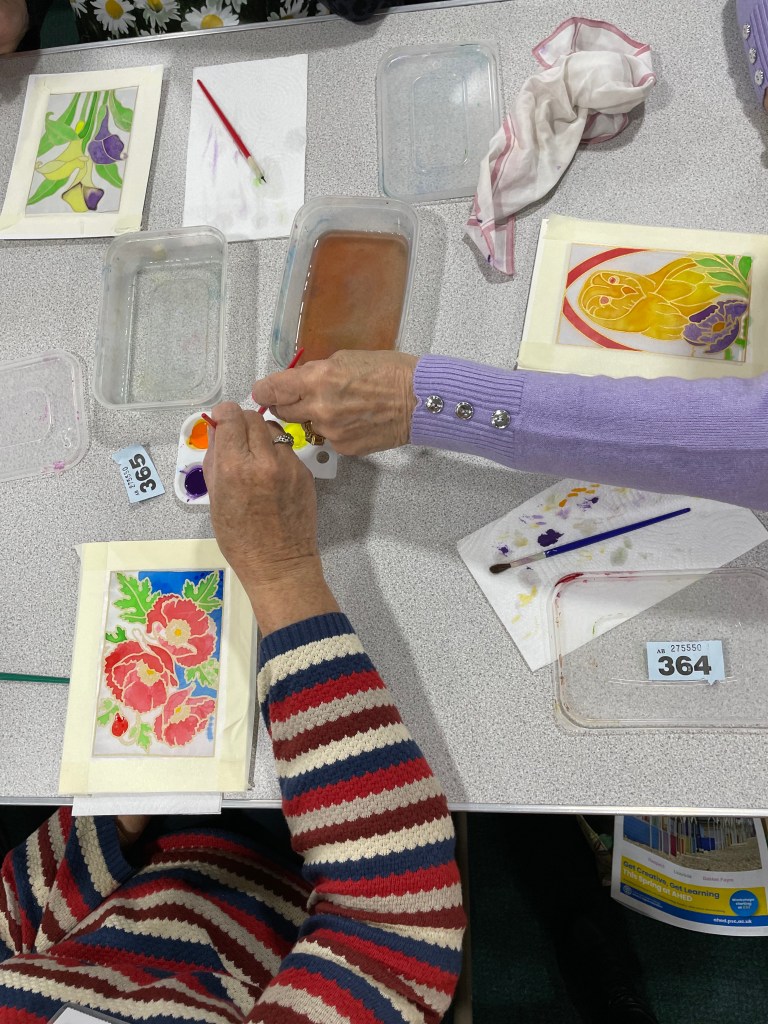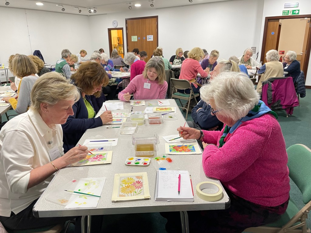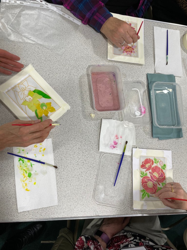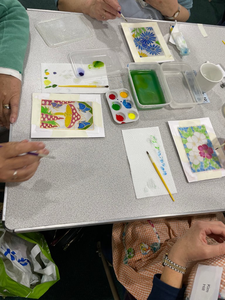 This month our speaker was Deborah Wheeler from Whitchurch Silk Mill. She gave us a light hearted introduction to Silk Painting. Whitchurch Silk Mill is the oldest Silk Mill in the UK and is still in the original Grade 2 building. Silk painting originated in Thailand, Vietnam, India, China and Japan. Silk painting is the practice of applying paint to silk textiles.