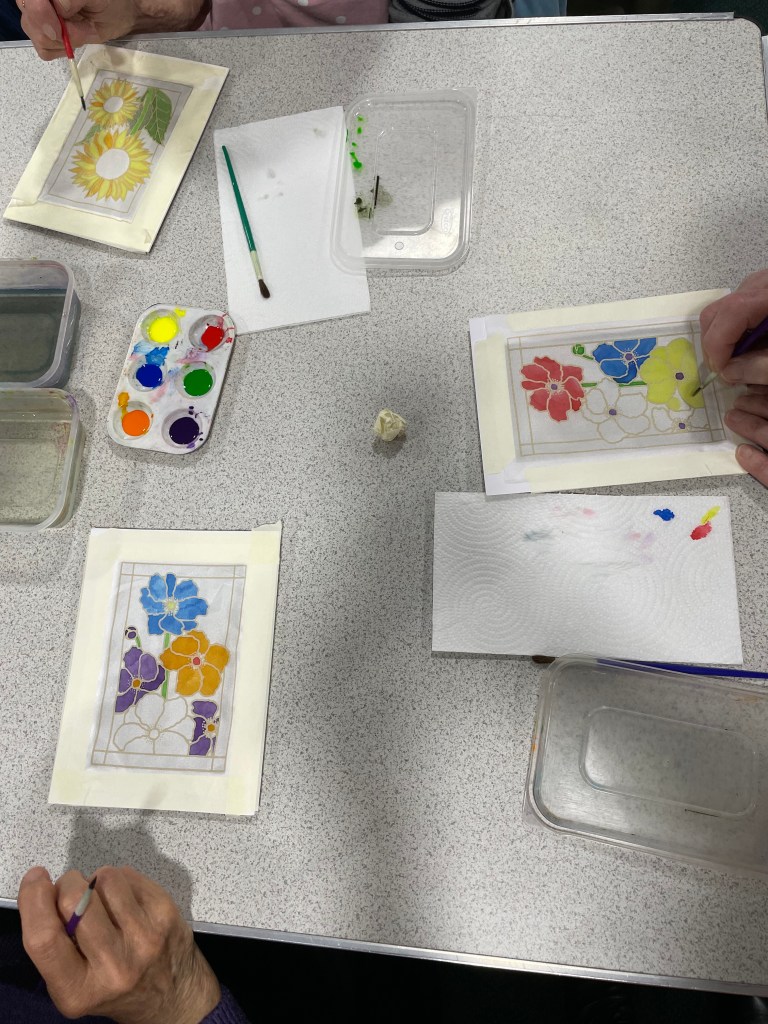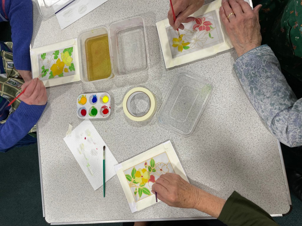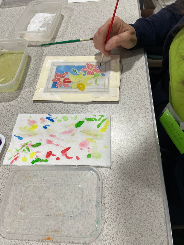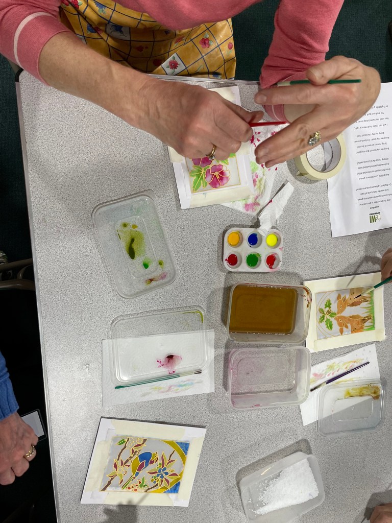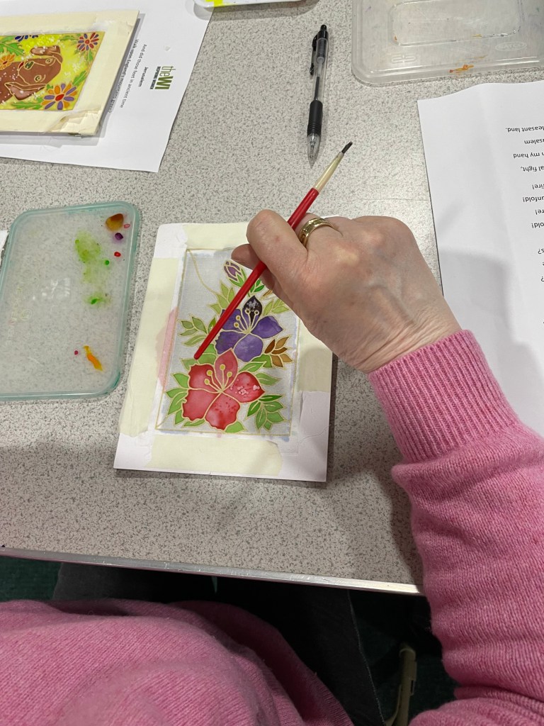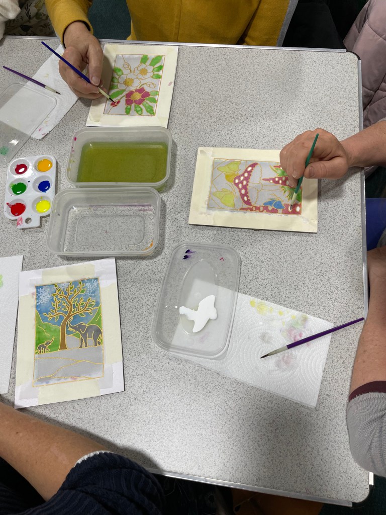 We had brushes, water containers, a mount and we chose our Gutta pattern already prepared with an outline to paint immediately to make a card using the Serti technique.