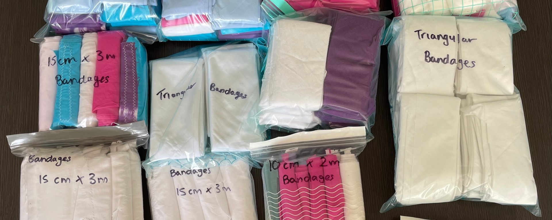 We managed to make around 40 Triangular bandages during this session. Rolled bandages and Tourniquet ties were also made.