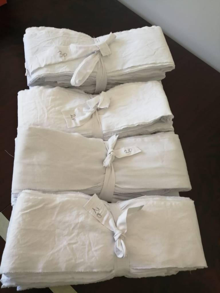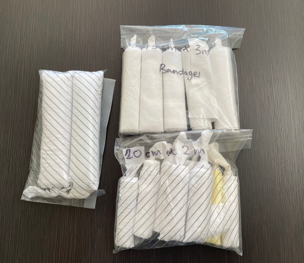 Meral has continued to be busy and has made a further 42 triangular bandages and 90 tourniquet ties! Meral has also made lengths of bandages that Anne H is busy rolling!
