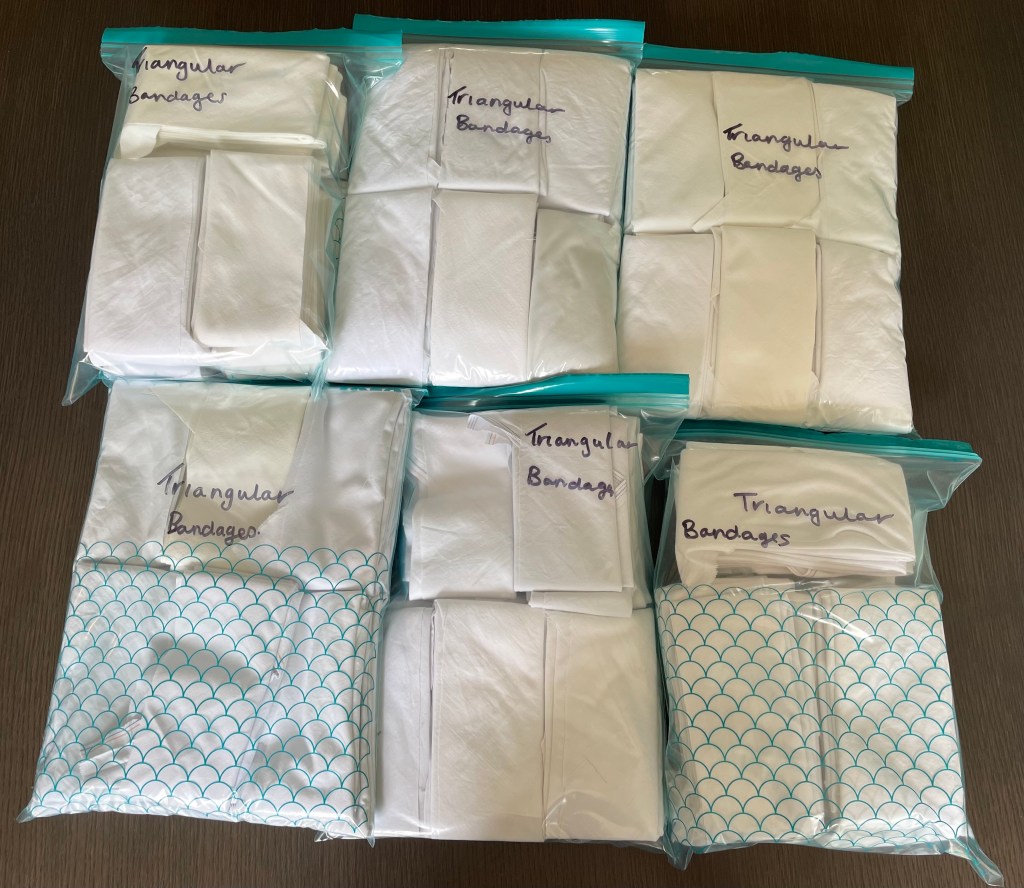 Approximately 80 triangular bandages were made today. These go into trauma packs (two in each trauma pack) and over 1500 packs have now been sent to Ukraine. Avery from New Forest for Ukraine is very grateful for our help in achieving this.