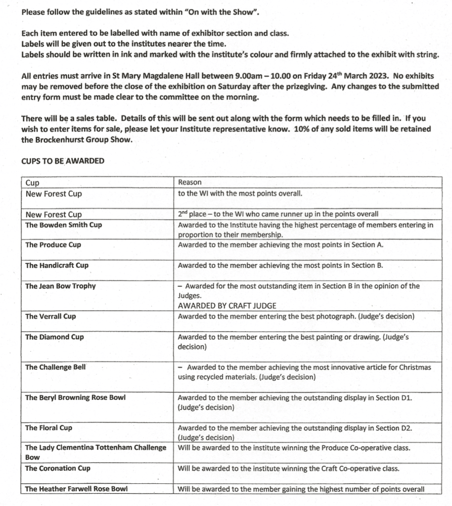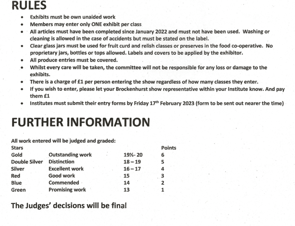 The Group Show is not about entering the perfect item! Entries are given a score out of 20 and these score are added together for each WI. So the more entires we have, the better chance we have of winning the overall cup!