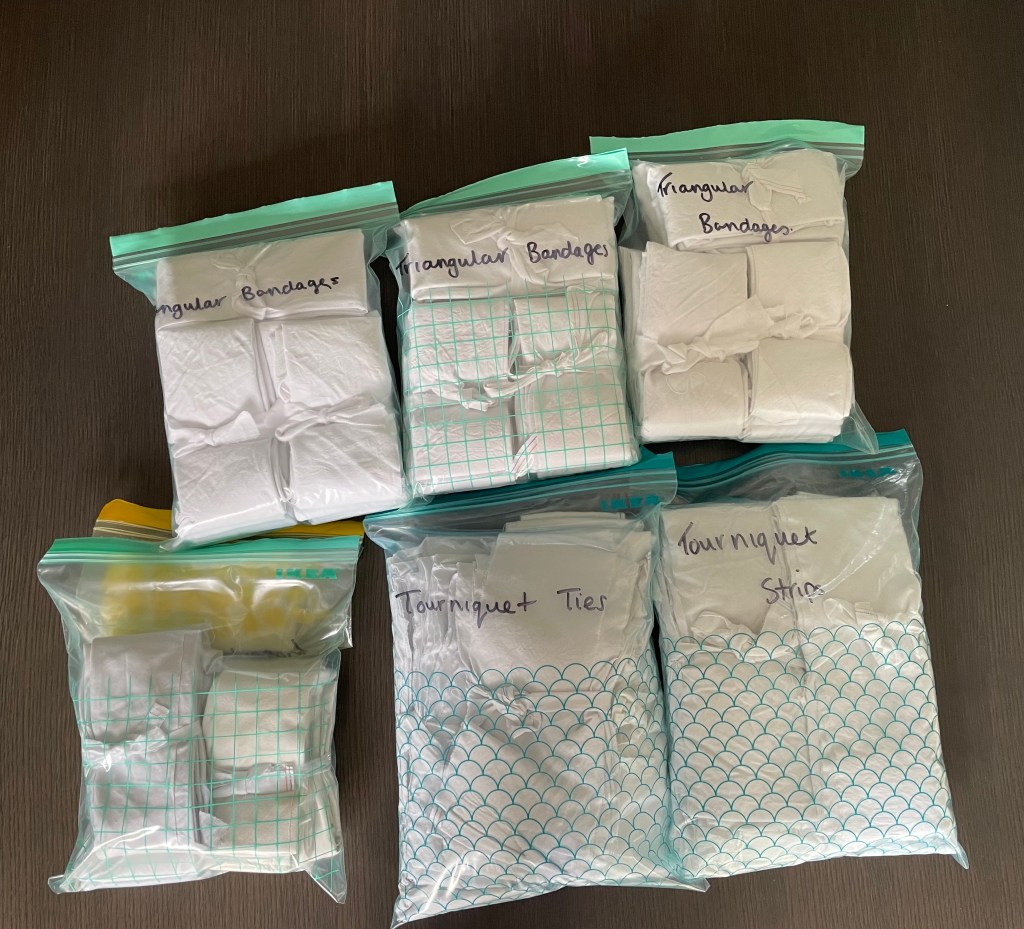This week Julie hosted the session and Carole, Maureen and Julie prioritised making triangular bandages and tourniquet ties which go into the trauma packs. Around 45 triangular bandages and tourniquet ties were made.