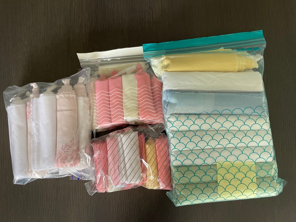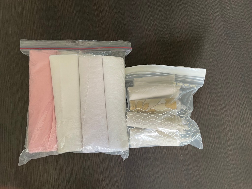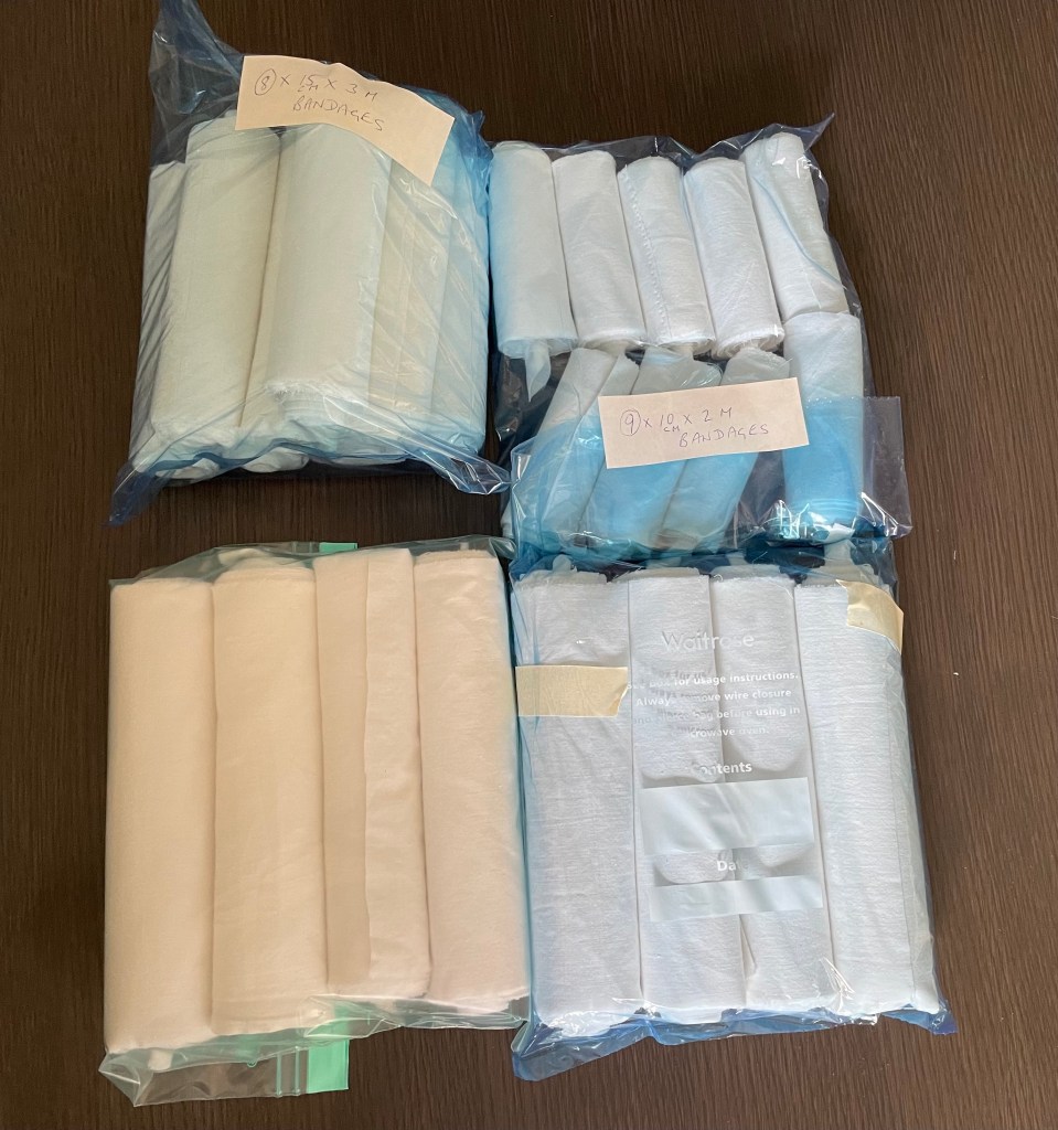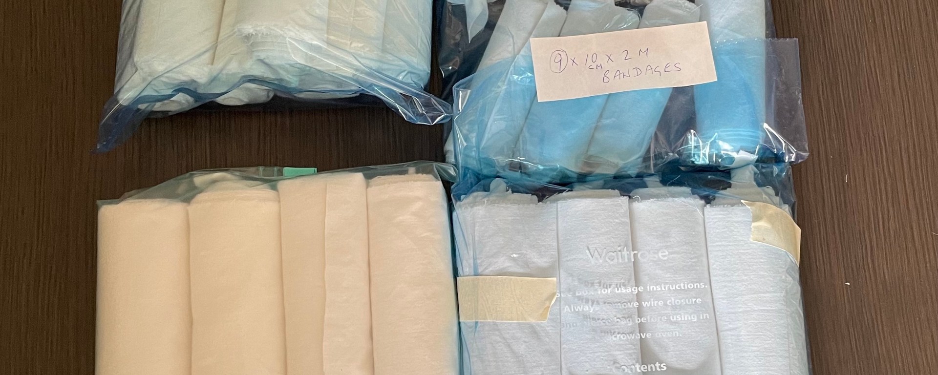As has been mentioned, at our bandage making sessions, we have been prioritising making triangular bandages which are most needed for the trauma packs Ukraine as two triangular bandages go in each trauma pack.