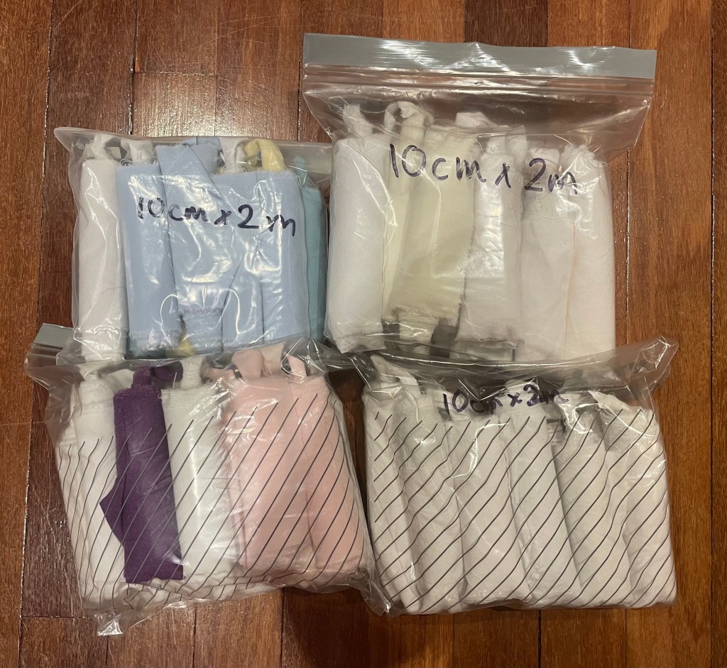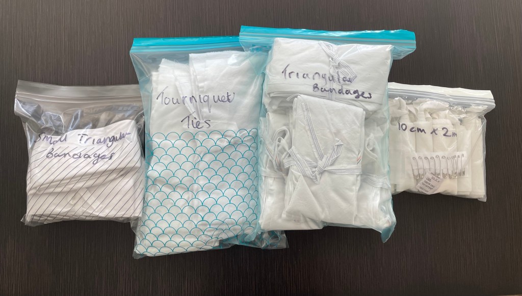 We made 18 triangular bandages, tourniquet ties and ripped and rolled sheets to make rolled bandages.