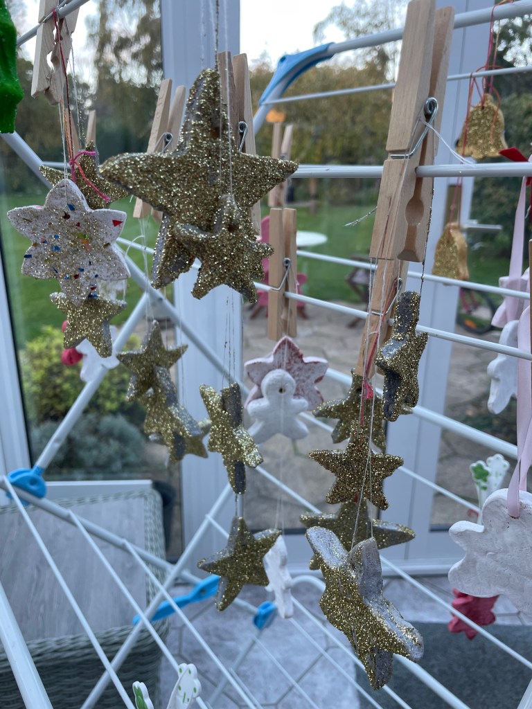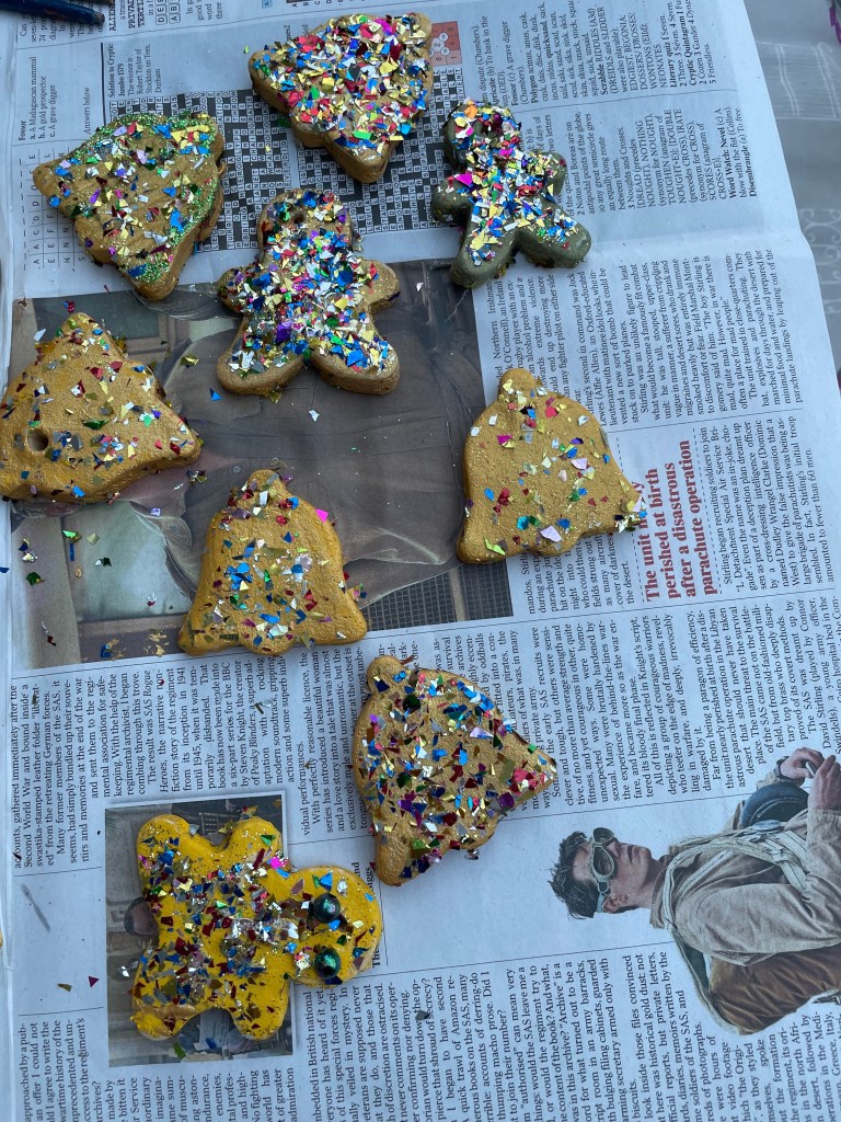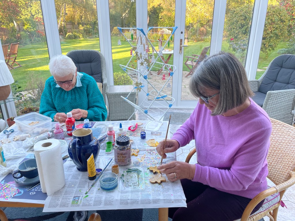 Carole, Maureen and Julie painted the salt dough decorations that were made last session.