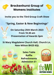 25th March sees the 73rd Brockenhurst Group Craft Show. We are asking our members to consider taking part in this event. You don’t need to be a member of the craft group to take part and we know that many of you do a variety of crafts and cooking at home and have many talents that you hide under a bushel!