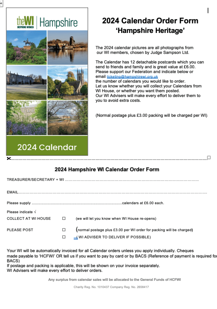 If you would like to order the 2024 W.I. Calendar, please let Zena know and give her your payment. Note the closing date for orders is 30th June. The details are below.