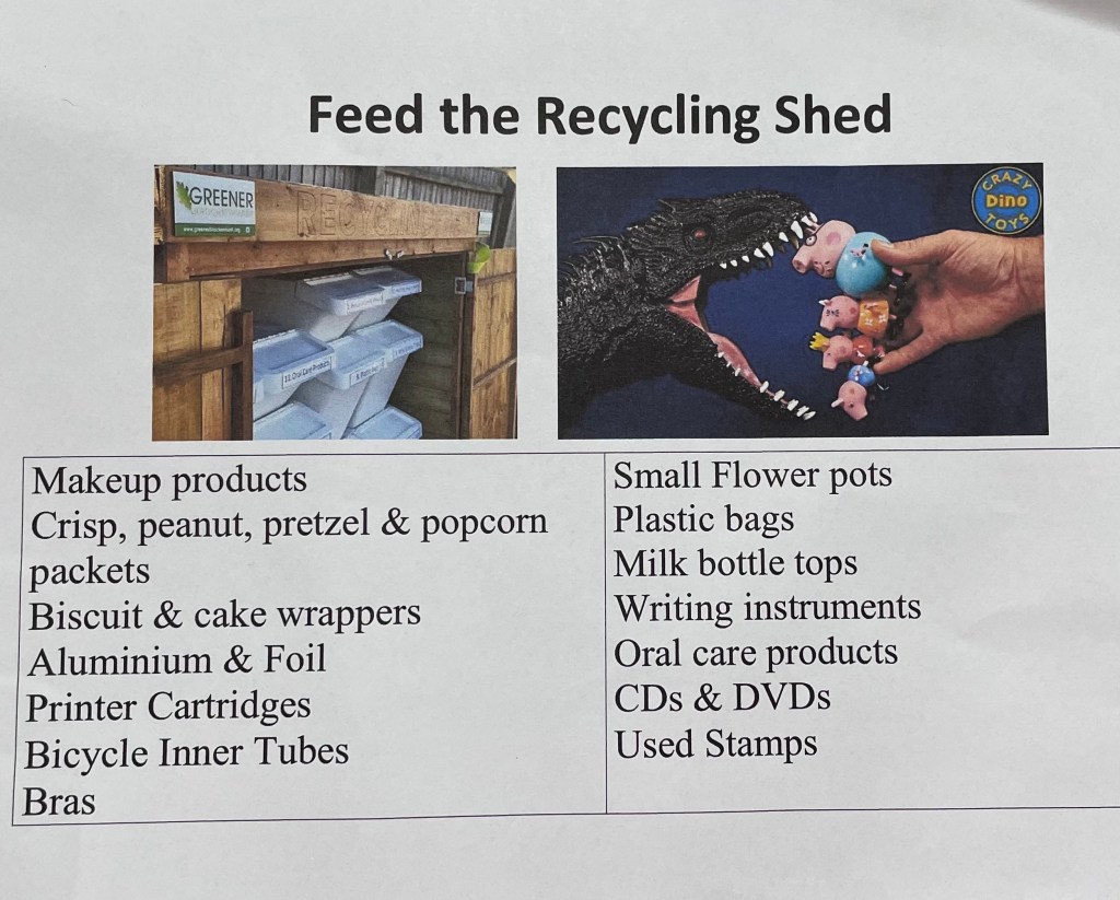 Britta reminded us about the fantastic recycling facility we have is the village hall car park and all of the items that you can recycle in the Recycling Shed: