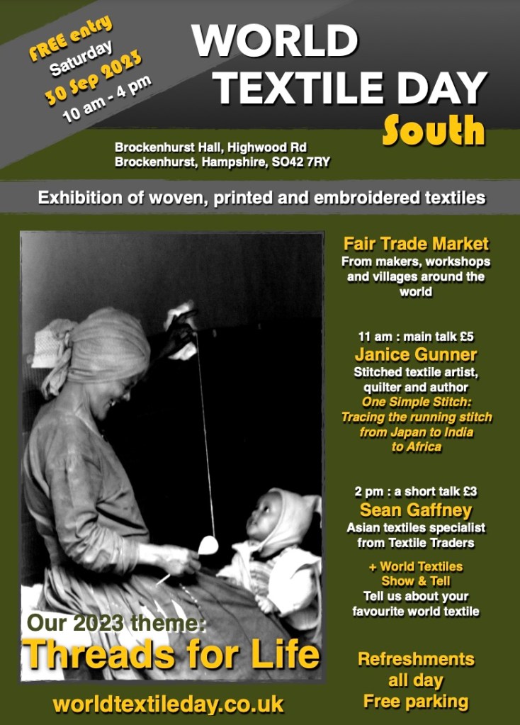 The South of England World Textile Day is going to be held on Saturday 30th September from 10am-4pm at Brockenhurst Hall, Highwood Rd, Brockenhurst, Hampshire, SO42 7RY