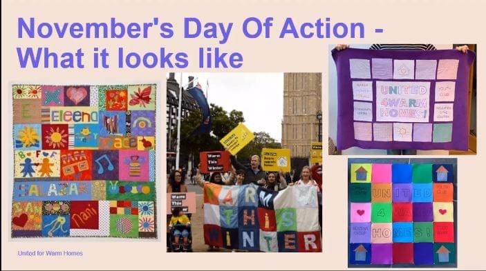 There will be information on display about an activity we have been invited to take part it, to produce squares for a community quilt, supporting the National United for Warm Homes Campaign. This is a joint effort by Greener Brockenhurst with Friends of the Earth to produce a visual aid reflecting the need for renewables, insulation and warm homes. If you are interested in making a square as part of this, information will be on the table with the other sign-up sheets, as well as a link for more details. We have many talented members who could make a square so we hope that as many people as possible will take part.