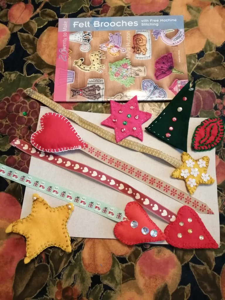 In the second October session, five ladies met at Carole’s house and made a variety of embroidered felt book marks. One member also worked on her own patchwork project of paper piecing hexagons which looked quite complex to carry out, but will be very pretty when finished, and inspired some of us to be more ambitious! The rest of the group cut out and embroidered felt shapes, attaching ribbons to them to make bookmarks.