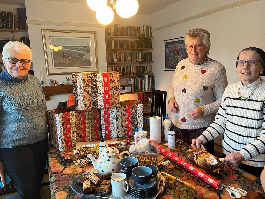 In our first session in November, ten members of Craft Group met at Jackie’s home where she demonstrated making gift bags and pouches, and gave ideas for making tags and twisted cords to attach these. The bags were made by folding and gluing paper to make bags which could be made in different sizes for small gifts. These could be made from brown kraft paper or patterned wrapping paper, and we were shown some plain examples decorated using the embroidery stitches on a sewing machine, which were very attractive. The folding order could be challenging, perseverance paid off! The tags could also be decorated with automatic sewing machine embroidery stitches, or with punched snowflakes or hearts from splodge or patterned paper. We were also given a template to make a gift pouch from card, which would be very festive made out of gold or silver card, again a sustainable way of wrapping a small gift. The afternoon was ideally timed in advance of Christmas!