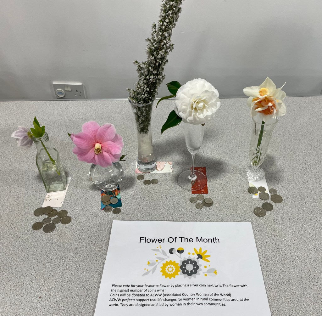 This gorgeous hellebore received the most votes in our ‘Competition of the Month’ but there were camellias, a daffodil and heather also on show. The silver coins that we vote with, are donated to ACWW (The Associated Country Women of the World).