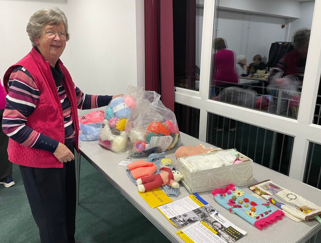 Rita did a wonderful job of explaining what her ‘Bandages for Ukraine’ group does on a weekly basis. Used sheets are torn and sewn into the desired lengths before being rolled ready for use. It was salutary to think about the destined use of the bandages. Tiny layettes were also held up as Ukrainian mothers are desperate for clothes for their new born babies. Many members generously donate yarn and skill to make these small items to send out in filled shoe boxes. Booties and mittens are needed and Rita asked for knitters to help out with these.