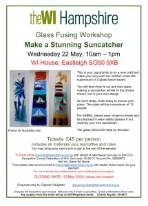 Wednesday 22nd May 10 am – 1pm, at WI House, Eastleigh Glass Fusing Workshop – Make a Suncatcher £45 per person includes all materials, tea/coffee and cake. Email here to book.