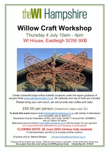 Thursday 4th July 10 am – 4pm, at WI House, Eastleigh Willow Craft Workshop – Make a Butterfly £60 per person includes all materials, tea/coffee and cake. Click to book by email.