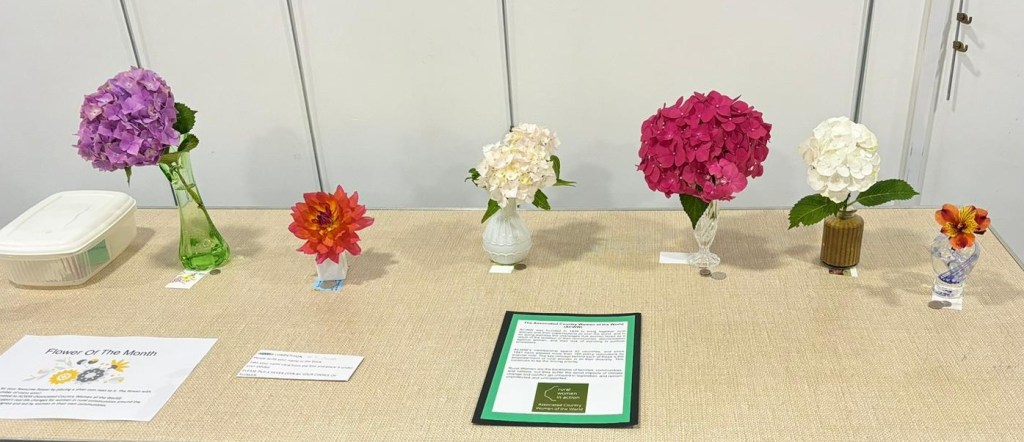 The competition of the month was a single flower in a vase. Despite stiff competition this month it was won by Maureen with her stunning hydrangea. Donations from this competition go to ACWW.