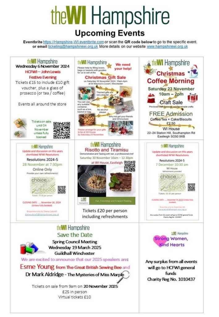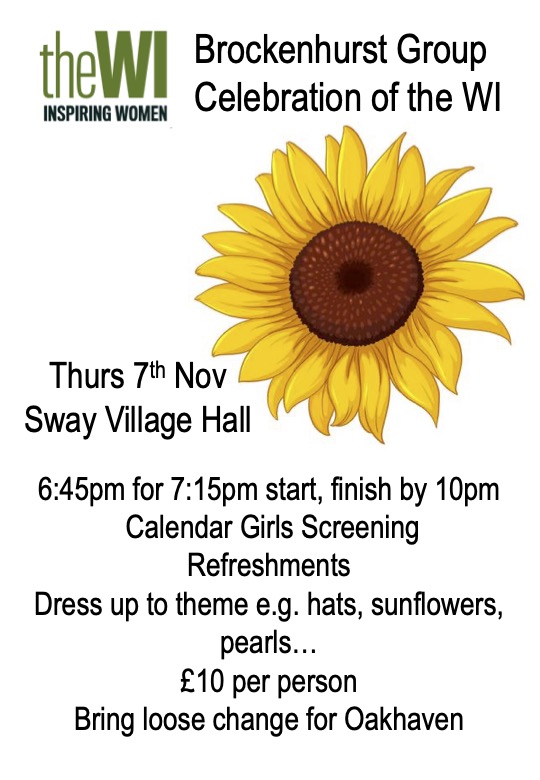 Brockenhurst Group Social Event in Sway: On Thursday 7 th November 2024, Sway WI will be offering a screening of the film “Calendar Girls” in Sway Village Hall starting at 6.45 and the film starting at 7.15. Each WI in the group is offered 25 tickets costing £10 each for their members (not £5 as stated in the email from Liz). Refreshments available during the intermission. Anyone attending is encouraged to dress in “twin set and pearls” or fuddy-duddy tweeds! More information is available via Julie.