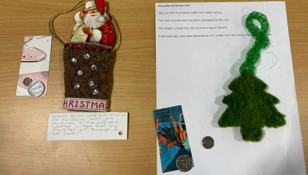 The Competition of the Month in aid of ACWW was a recycled item made into a Christmas tree decoration which must be able to hang on a tree. This was a tie between Anne N and Julie.
