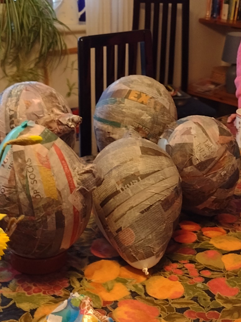 For the papier mache, we tore up newspaper and glued strips onto inflated balloons, adding pieces of egg box. We will need to add more layers at another meeting, perhaps adjusting the shape, and then paint them.