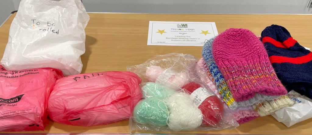 Rita and her team of bandage makers and knitters had a table of items that will be sent to Ukraine..