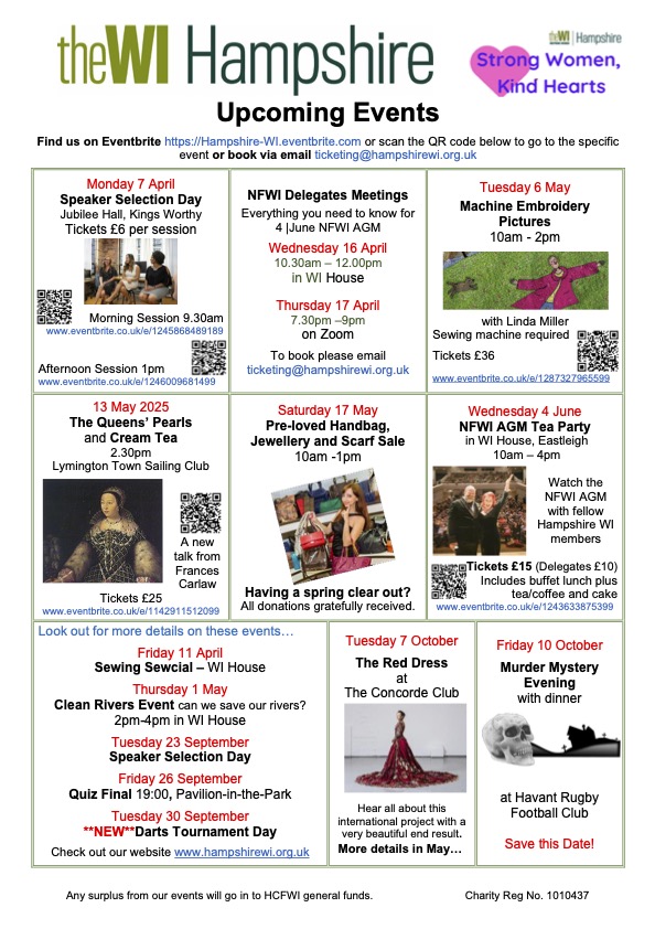 Our main fundraiser for the year, the Needlework Fiesta takes place on Saturday 26th & Sunday 27th April 2025 at Brockenhurst Village Hall. Brockenhurst WI are running the refreshments stall at this event and require cakes and volunteers to serve tea/coffee, cakes and lunches on the day. Please sign up at Monday’s meeting or contact us. Thank you.