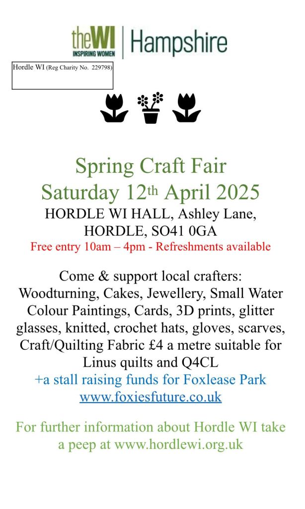 Hordle WI have their Spring Fair on Saturday 12th April at the Hordle WI Hall, from 10am-4pm. As well as a range of craft items, fabric will be on sale from £4 a meter.