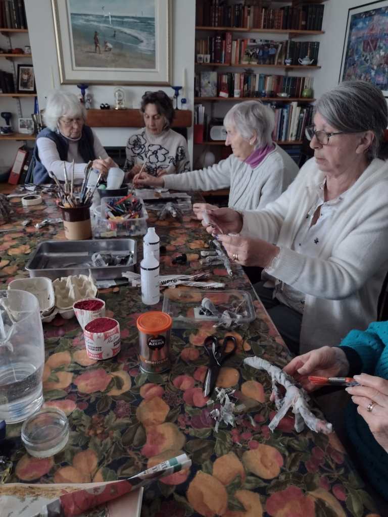 Members of the craft group met at Carole’s for a pot luck of activities. Carole had researched a pop-up card, but was not happy with the design, so we all did our own thing. Several people painted their papier mache “wild animals”, but others felt theirs were too wild to be useful! Others decorated flower pots with decoupage, which looked very colourful.