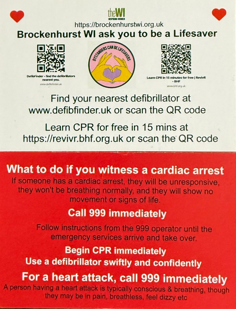 Today, 16th October is World Restart a Heart Day. So Brockenhurst WI took our campaign and our bunting made by our Craft Group out into Brockenhurst Village and gave out information cards letting people know where they can find the nearest defibrillator (wherever they are in the country). The defibrillator locator website can be found here.