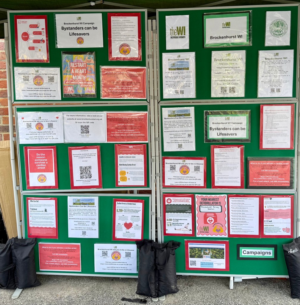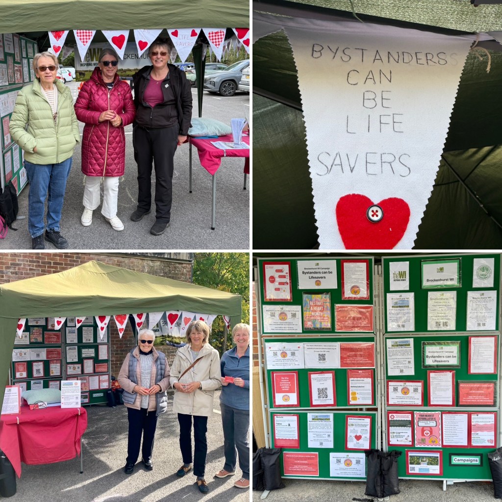 October started with Brockenhurst WI having a stall at Friends of Brockenhurst Station’s Artisan Market, where we had an awareness stall promoting our campaign, ‘Bystanders can be Lifesavers’. We gave out information cards and enjoyed engaging with those attending.