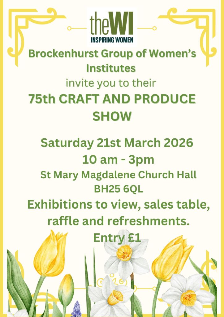 Group Event – Bookfest on the afternoon of Friday 17th April, St.Mary Magdalene Church Hall. BROCKENHURST GROUP SOCIAL EVENT 2026 from L 2pm-4.30pm Cost £10 There will be talks from local authors. There will be tea, coffee and cake. The ticket price also includes a raffle ticket.Please take a preloved book which is a favourite of yours to donate. Put a card inside it saying why it’s your favourite. Then gift wrap it. At the end of the event, you will get to select a book to take home with you. 15 tickets are issued to each WI, and if there are spares from other WIs, these can be swapped if some branches are oversubscribed. sign up sheet at Monday’s meeting, or contact us to sign up. Your place will be secured when payment has been received.