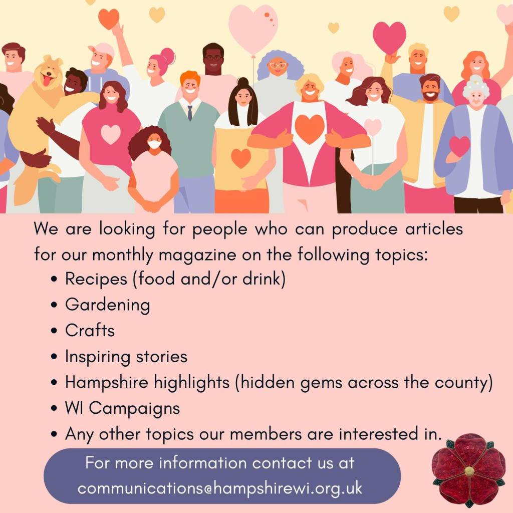 Hampshire WI are looking for people who can produce articles for our monthly magazine. This can be a monthly, quarterly or just one offs. If you are interested contact communications@hampshirewi.org.uk