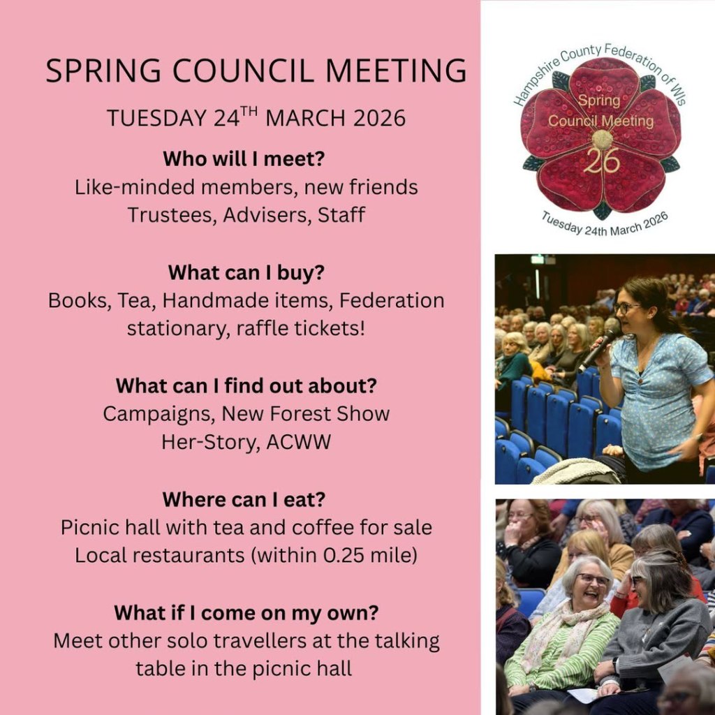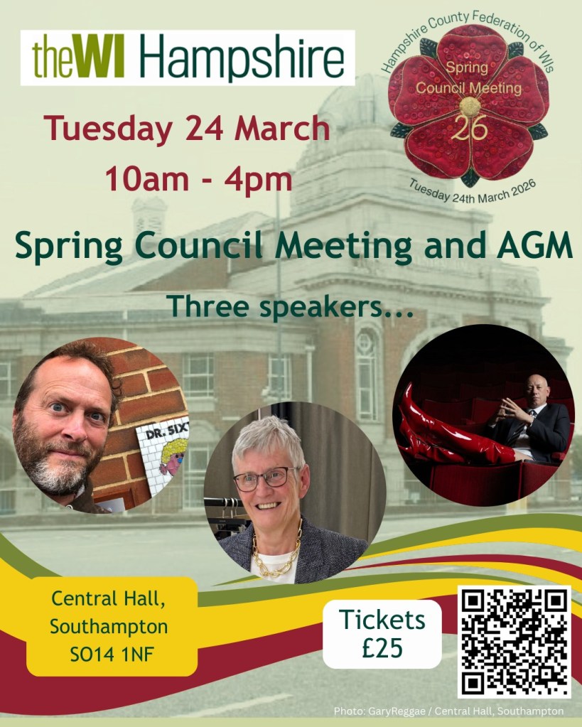 Tuesday 24th March 2026 Hampshire Federation of Women’s Institutes’ Spring Council Meeting at Central Hall, Southampton. There are some great speakers lined up. Get your tickets here for a day of fun. There are three speakers, 700 members, bookshop, and other shopping. Our members are already excited as “Steve Pateman is the best, most engaging speaker!” Get your tickets £25 via Eventbrite or email ticketing@hampshirewi.org.uk